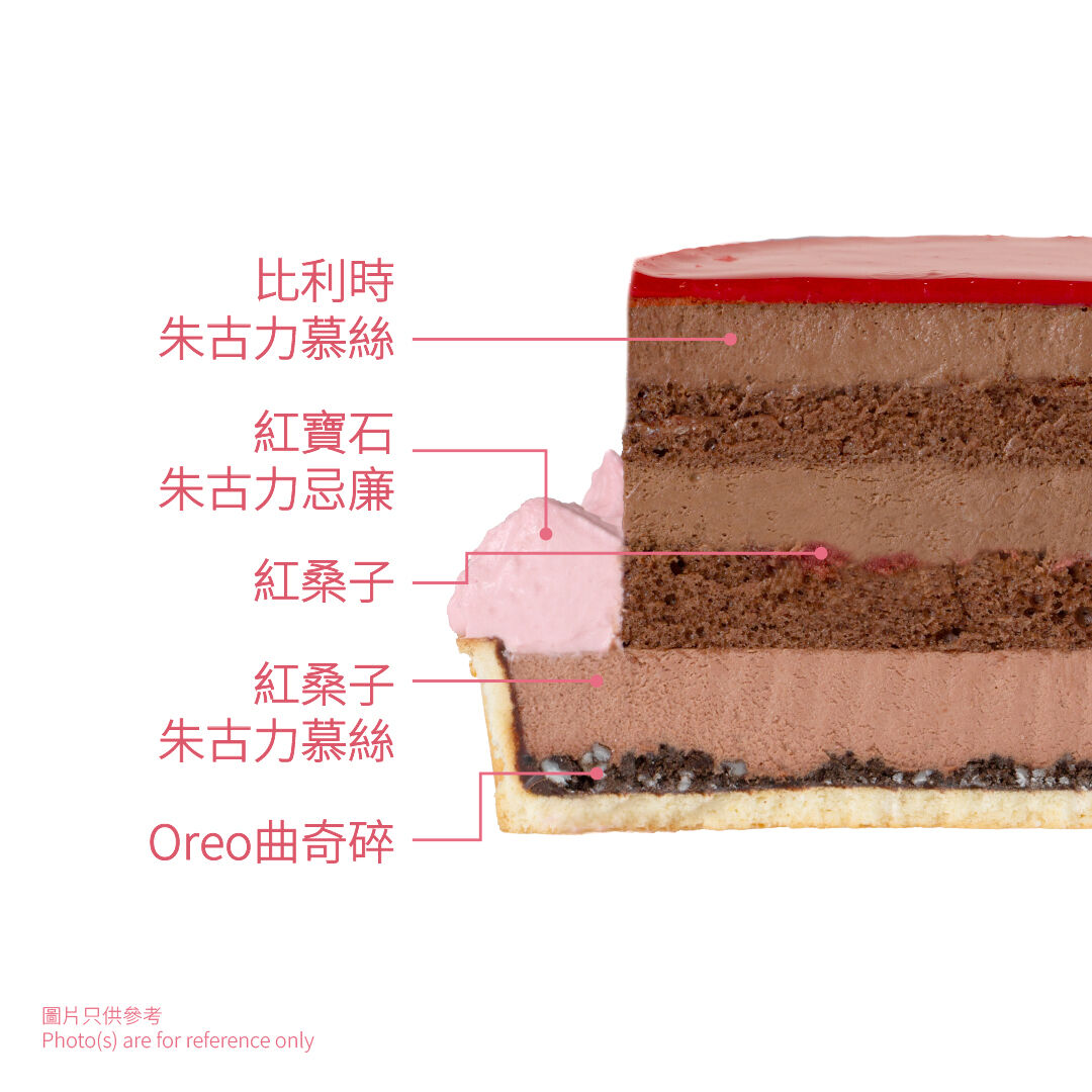 Double-layer cake design, the cake is elegantly finished with a luxurious red glaze and adorned with delicate rose chocolate for an elegant, romantic presentation. The bottom layer features rich Belgian chocolate mousse and soft sponge, and raspberries are added to balance the overall sweetness with bright, natural fruit notes, which deliver depth and harmony in every bite. Airy and moist chocolate sponge, intensifying the deep cocoa flavour. It pairs beautifully with the raspberry chocolate mousse and the satisfying crunch of cookie crumbs, resulting in an exciting contrast of textures and flavours that keeps you one irresistible bite after another! Each V-Day Cake comes with a complimentary festive carrier packaging.