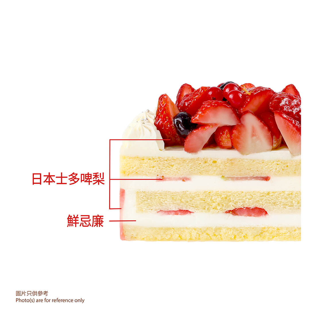 經典日本士多啤梨忌廉蛋糕,香甜多汁的原粒士多啤梨,完美協調藍莓及士多啤梨乳酪慕絲。鬆軟海綿蛋糕夾層加入士多啤梨醬及果粒,甜酸搭配令味道層次分明,讓春天更動人、更閃耀!兩款尺寸可選,大小聚會都可以共享這份春日限定的美味!