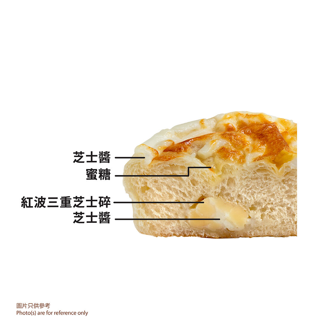 軟法包麵團中混入紅波三重芝士碎與芝士醬,面層再淋上蜜糖及芝士醬,創造出三種不同的口感與風味。芝士層層疊加,加上蜜糖的甜蜜,完美中和了芝士的鹹香。經烤焗後,芝香四溢,濃厚卻不膩,口感相當豐富。每一口都是甜鹹之間的極致誘惑,十分滋味,芝士控必試!
