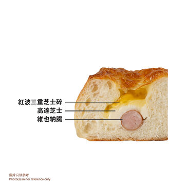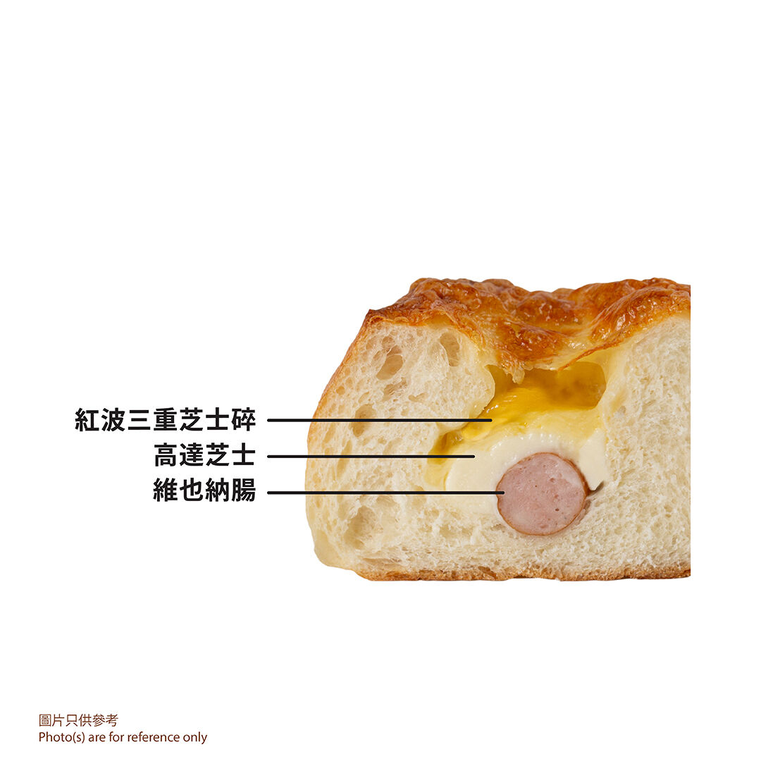 法式棒擁有金黃酥脆的外皮,經過烤焗的芝士碎香氣撲鼻。內裹的紅波三重芝士碎、高達芝士及維也納腸完美搭配。芝士的濃郁香氣與香腸的多汁鮮美相輔相成,瞬間俘虜您的胃口,讓人回味無窮,滋味不斷!帶來無比的愉悅!