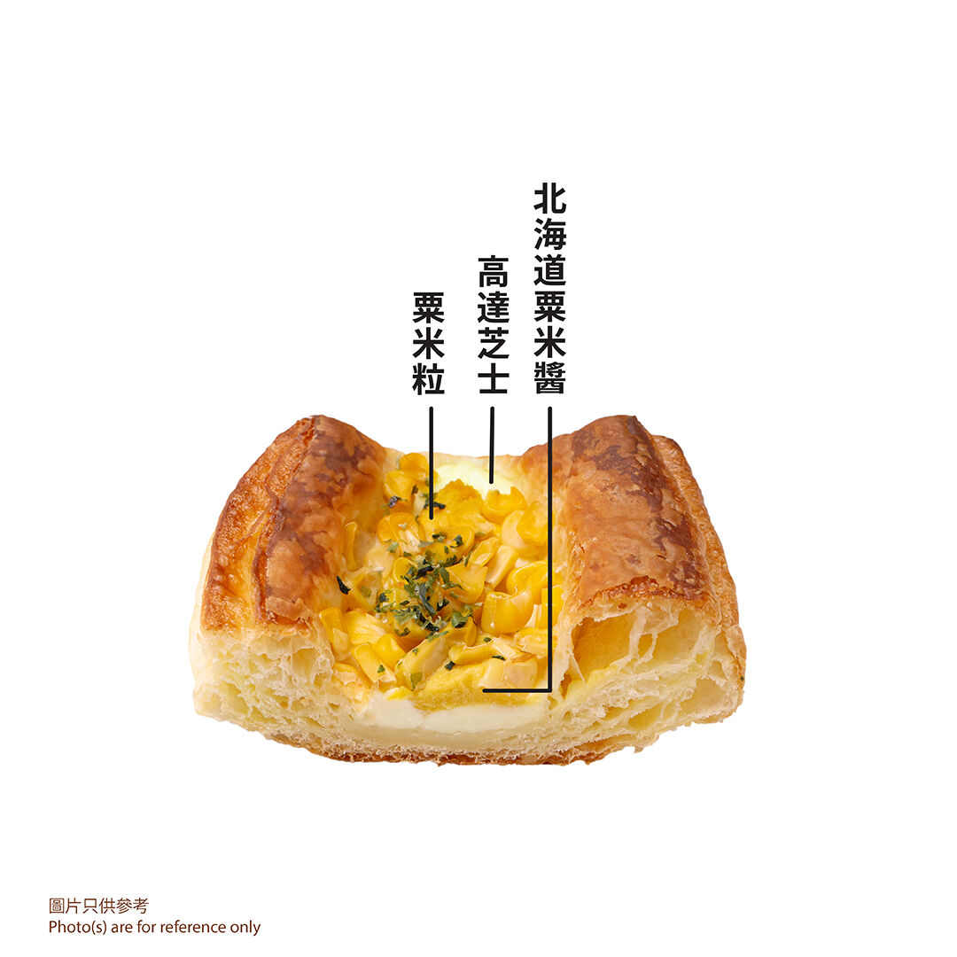 創造讓人上癮的完美平衡!濃郁的芝士奶香與香甜的粟米鹹甜交織,帶來令人驚喜的平衡味道。一口酥脆的牛角酥外皮,一口滿滿高達芝士和北海道粟米醬餡料,罪惡感與滿足感交匯,甜中帶鹹超上癮!讓人忍不住想要再吃一口!