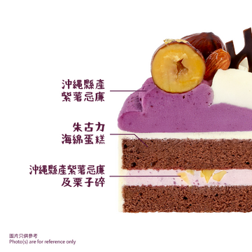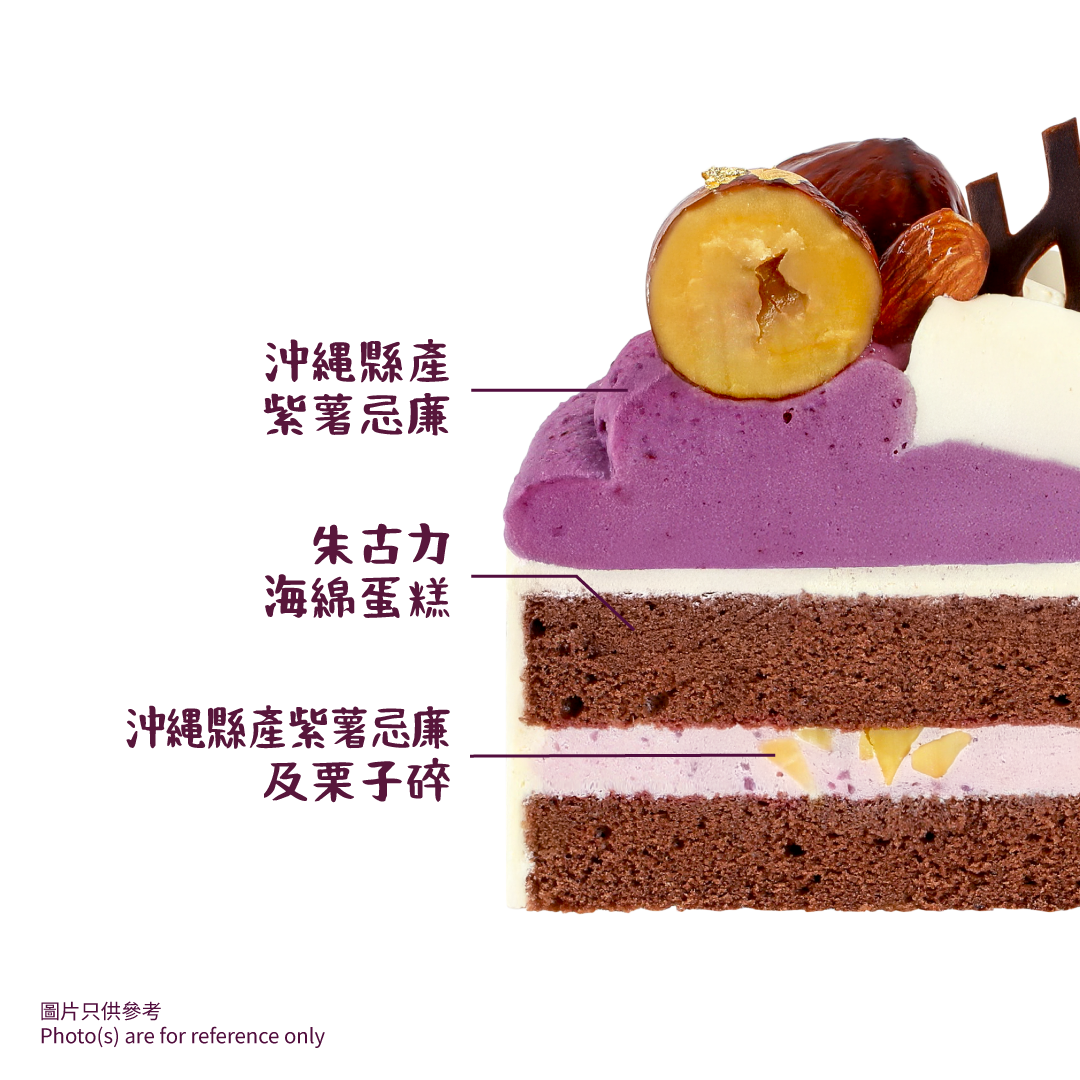 面層鋪滿以沖繩縣產紫薯製作的忌廉,紫薯香氣較為濃郁;下層的朱古力海綿蛋糕加入了少量冧酒糖水作調配,夾層的紫薯忌廉更特意加入栗子碎粒,淡淡的栗香為整體增添豐富口感卻不顯厚重,輕柔包裹味蕾,其細膩的朱古力風味與紫薯溫潤相融。配搭朱古力裝飾、栗子粒及杏仁,蛋糕造型精緻美味。