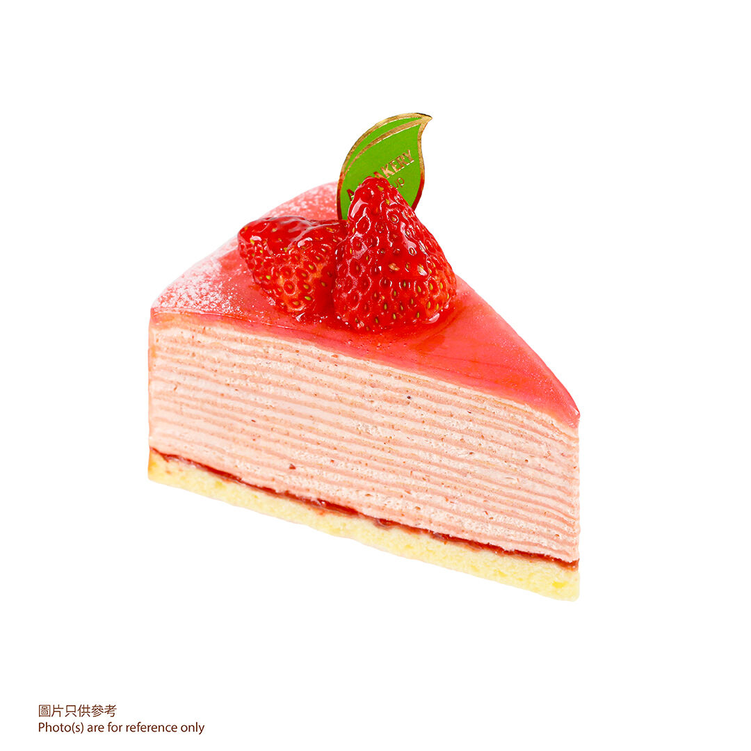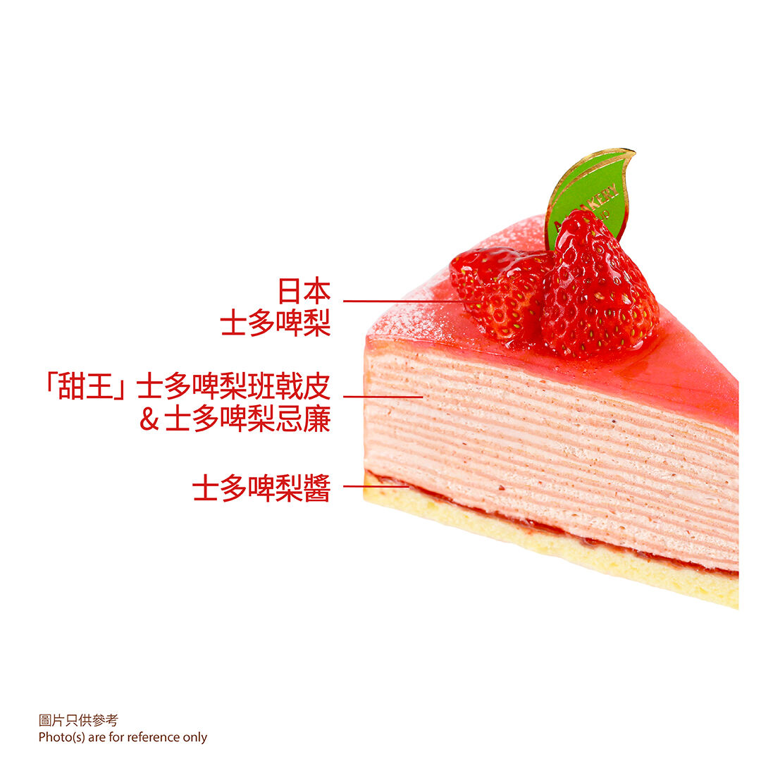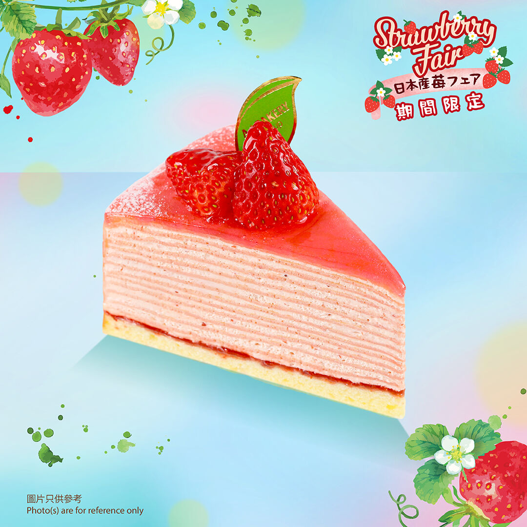 件裝日本士多啤梨千層蛋糕以甜王士多啤梨班戟皮與士多啤梨忌廉層層相間,頂層以士多啤梨果肉點綴,甜蜜入心坎,帶來極致甜美與心動體驗!