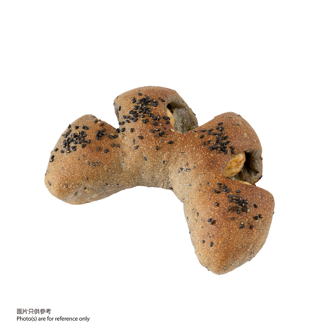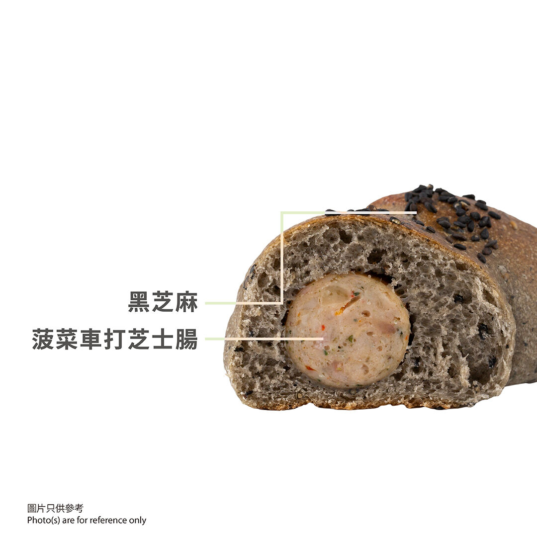 零罪惡感的腸仔包!使用菠菜車打芝士腸(微辣)為內餡,搭配黑芝麻麵團,再於外層撒上的黑芝麻粒,醇厚芝麻香氣和諧共舞,這份創新、健康的美味反轉你的味蕾!