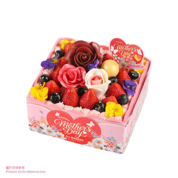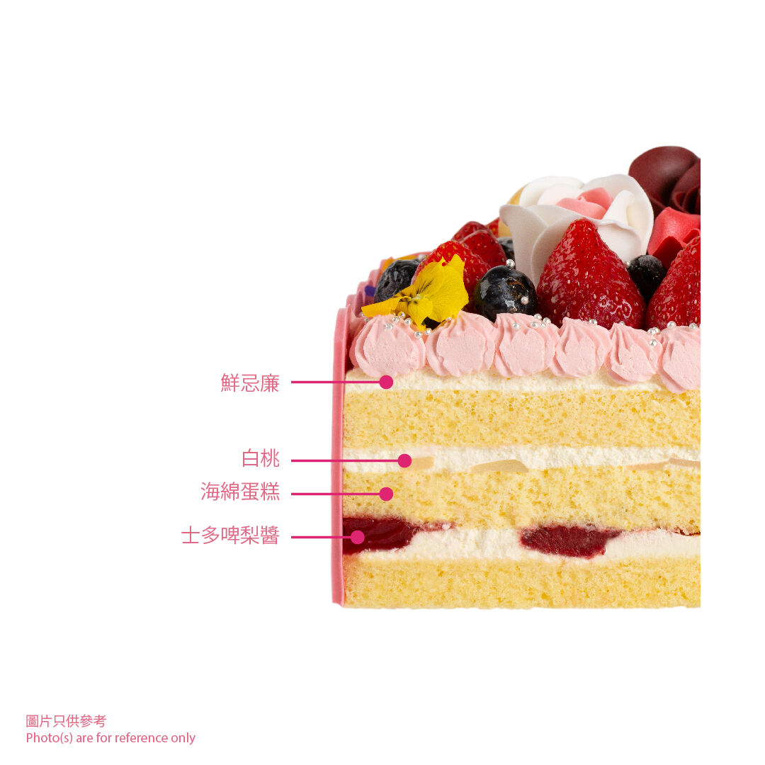 瑰麗花境 (15cm) 宛如一個盛開的花朵寶箱,配搭鮮紅飽滿的士多啤梨及夢幻粉紅色的忌廉唧花,旁邊食用三色花與優雅玫瑰造型糖皮裝飾輕擁點綴。內裡雪白鮮忌廉與鬆軟海綿蛋糕交織,中間藏著清甜白桃果肉與甜蜜士多啤梨醬,入口層次豐富,清新不膩。以馥郁果香與浪漫花境,獻給媽媽最美的一份甜蜜告白。
