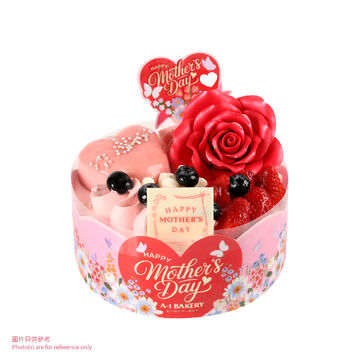 玫瑰心語 (12cm / 15cm;兩款尺寸可選) 以近年大熱的開心果為基調,夾層加入了士多啤梨餡料以及開心果忌廉,與綿密開心果海綿蛋糕互相搭配,口感豐富不單調。蛋糕頂層綴以原粒士多啤梨和心形甜王士多啤梨乳酪慕絲,搭配優雅玫瑰造型糖皮裝飾與精緻朱古力牌,將無限愛意化作一束專屬於媽媽的粉紅玫瑰花語。